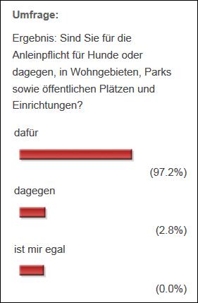 Die überwältigende Mehrheit spricht sich für die Anleinpflicht in bewohnten Gebieten, Parks und öffentlichen Plätzen und Einrichtungen aus. Auch wenn sich die Anleingegner sicherlich davon unbeeindruckt zeigen werden, sollten sie zur Kenntnis nehmen, daß sie mit ihrer Meinung und ihrem Handeln auf wenig Gegenliebe und Verständnis stoßen. Nicht nur, daß dieses Handeln von der Mehrheit der Menschen abgelehnt wird, es verstößt auch gegen Gesetze und kann unter Umständen unangenehme Folgen für den uneinsichtigen Halter nach sich ziehen.
